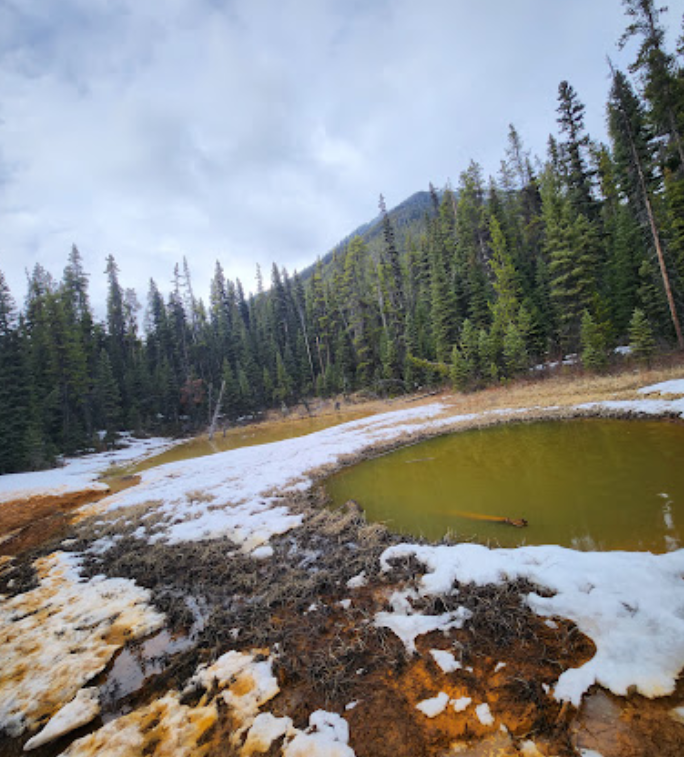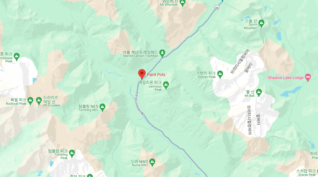 마블 협곡을 들리시고 약 2.5km 서쪽 지하암반수가 올라오는 천연수영장인 페인트포트가 있습니다. 옛날 빙하호 바닥의 침전물인 점토가 온천수에 의해 황색으로 물들어 특이한 풍경이 펼쳐집니다. 20세기에는 캘거리 염색공장이 채굴장을 설치했었으나 지금은 그 흔적만 남아있습니다. 혹 수영장을 밟게 되면 신발에 흙이 묻어 떨어지지 않으니 조심하시기 바랍니다. 구경만 하시고 가까이 가지는 마세요.